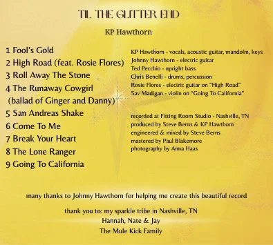 Known for her lush vocals, evocative songwriting, and genre-blending sensibilities, KP Hawthorn makes a striking solo debut with Til The Glitter End, out September 12th. A founding member of The HawtThorns and CALICO the band, Hawthorn brings her West Coast roots and Nashville polish together on a record that feels both familiar and entirely new, a vibrant reimagining of some of her most beloved past works, steeped in Americana, dream pop, and golden-era California tones.